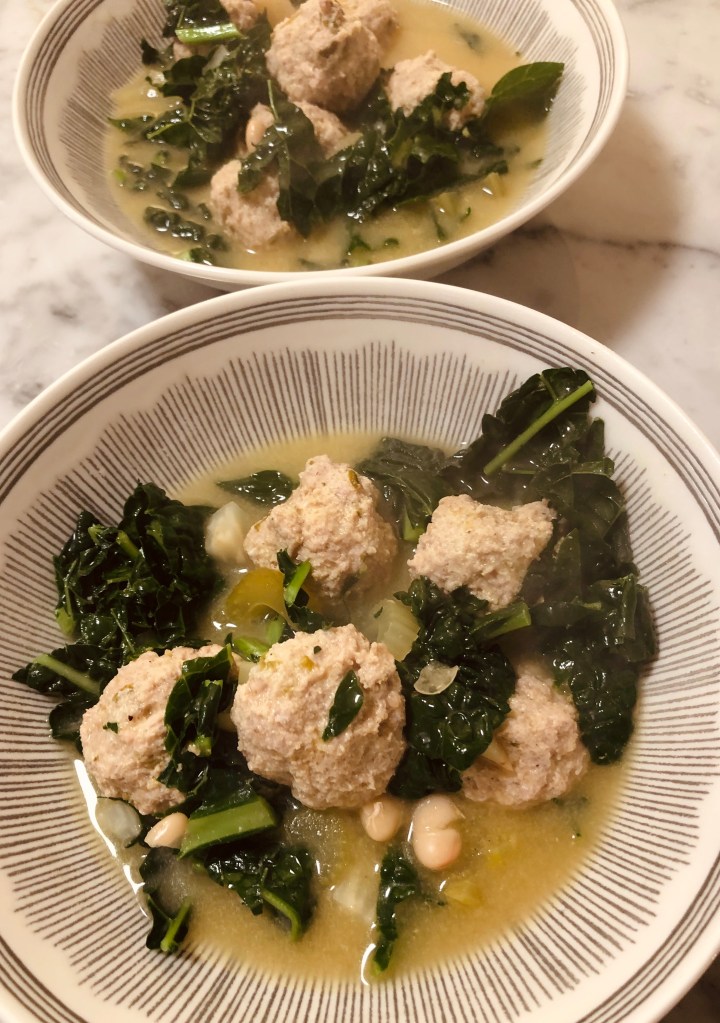 Bring the broth back to a boil and add the meatballs. Cook for 10 minutes or until done. Return the vegetables to the broth and add the white beans and kale. Cook for 2 more minutes.