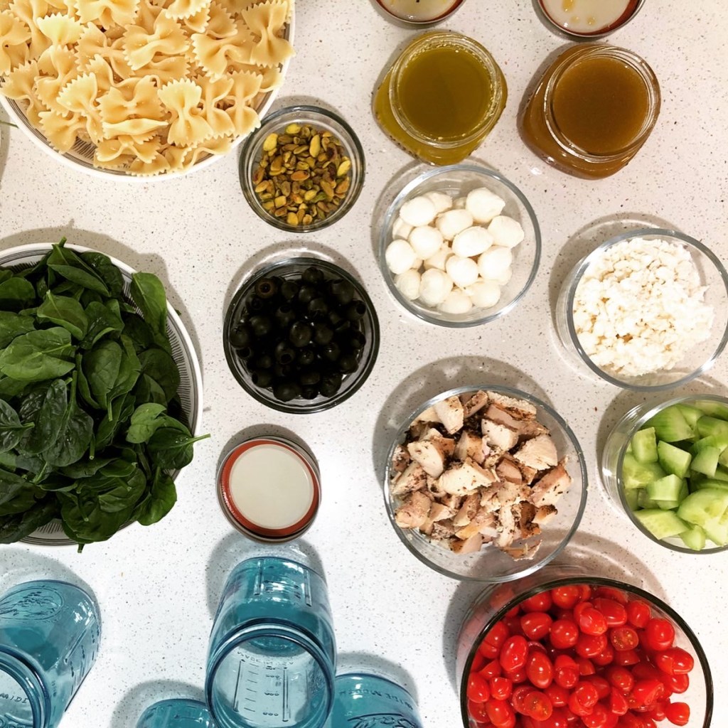 Layered from bottom to top of jar are: cherry tomatoes, balsamic vinaigrette, farfalle, pistachios (Pine Nuts were sold out at Trader Joe’s but that would have been my first choice), mini bocconcini and baby kale.