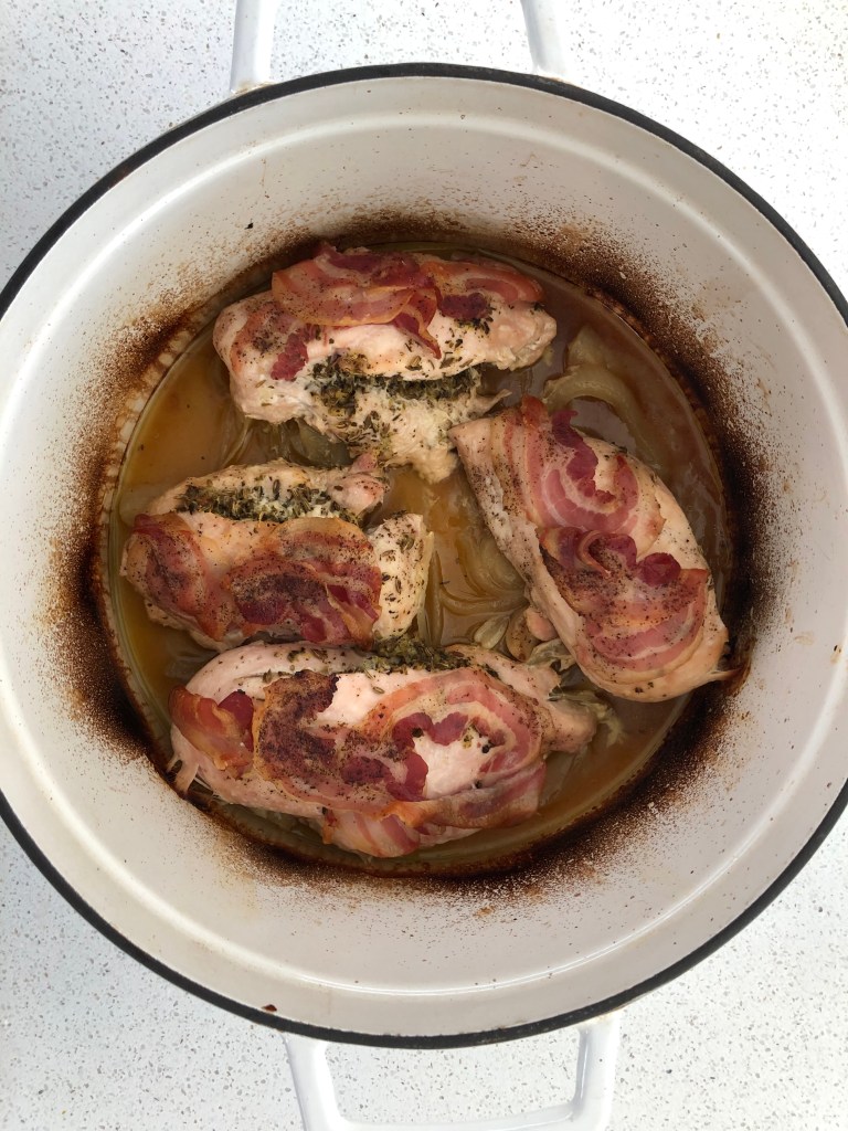 Place two slices on pancetta on each chicken breast and pour chicken broth and lemon juice at bottom of Dutch Oven.