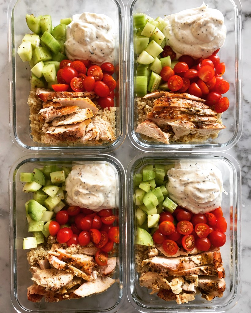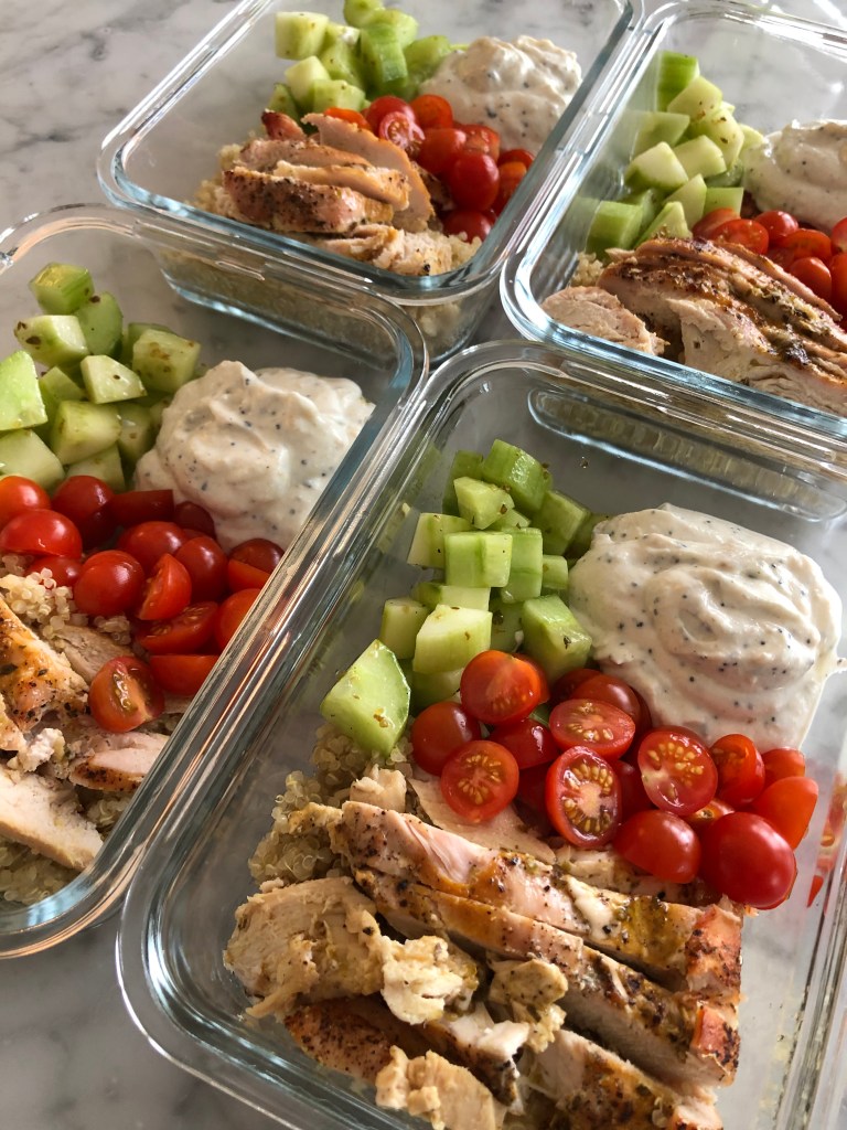 Very easy to put together. Roast chicken breasts with salt and pepper while you cook the quinoa. Make a simple cucumber salad by tossing cucumbers with lemon juice, olive oil and oregano. Make the sauce: plain Greek yogurt mixed with Everything Bagel seasoning, garlic powder and some lemon juice. Slice the tomatoes and assemble.