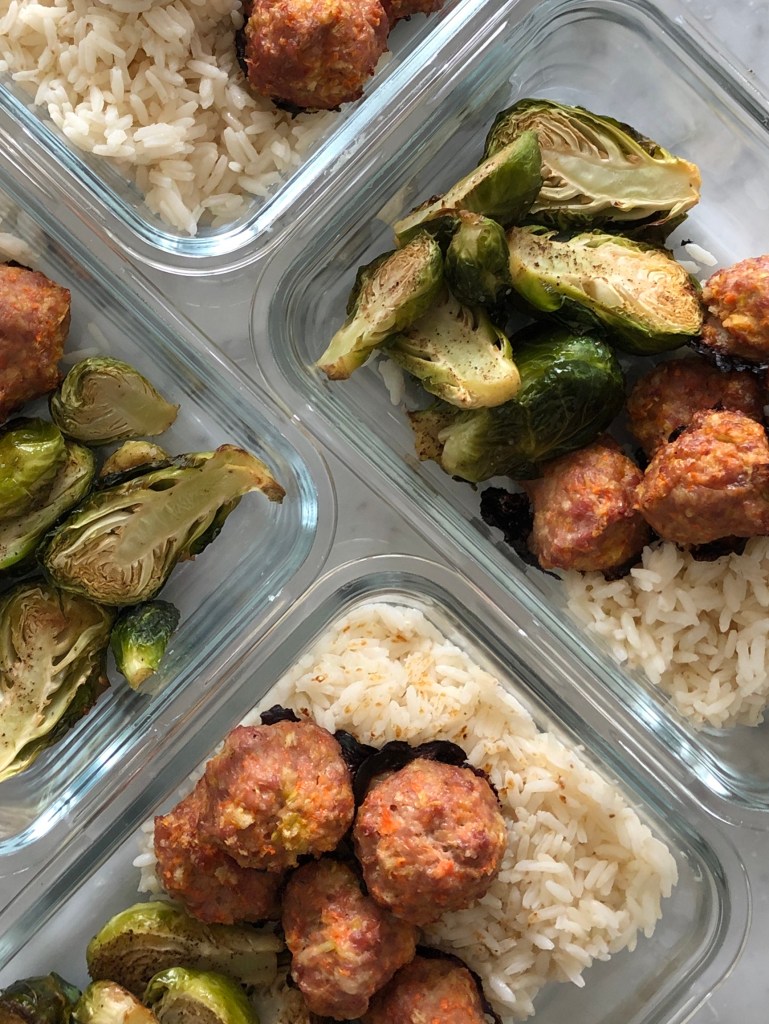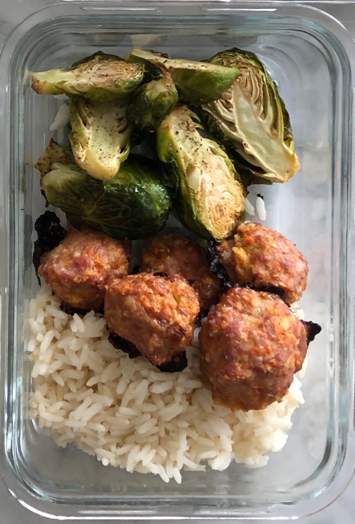 Carrot Meatballs, Roasted Brussels Sprouts and Rice