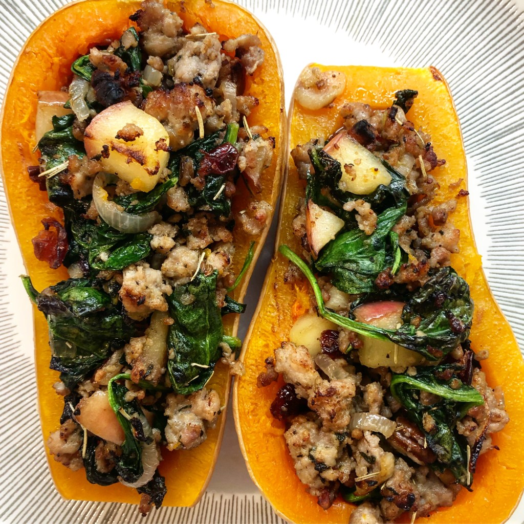 One upside of giving up Meal Planning is how I became more spontaneous in my cooking. Whipping up dinner with whatever I have on hand became a fun nightly challenge. I came up with this Stuffed Butternut Squash recipe by thinking about my favorite stuffing recipe. Hope you enjoy!
