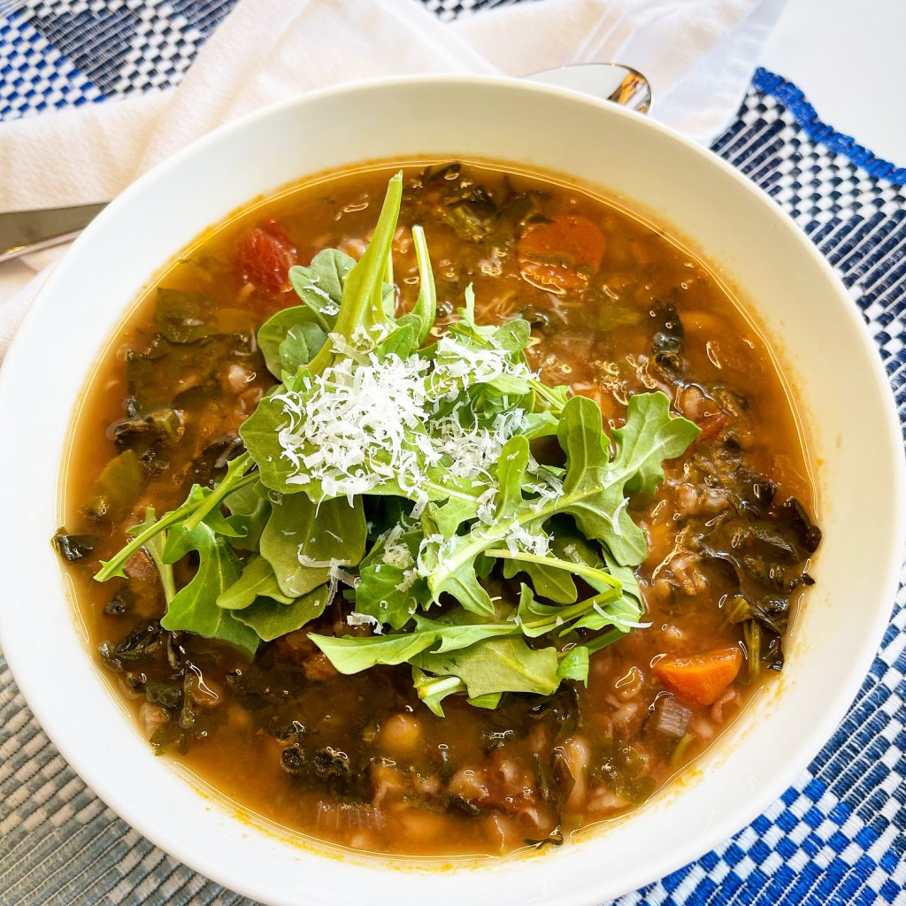 Bring to a boil and then lower heat to let simmer until farro is tender. This should take about 30 minutes but can depend based on your farro. Stir in the beans, kale, parsley and basil and cook until the greens are softened. Taste and adjust seasoning. If you feel the soup is too thick add more broth to reach the desired consistency.