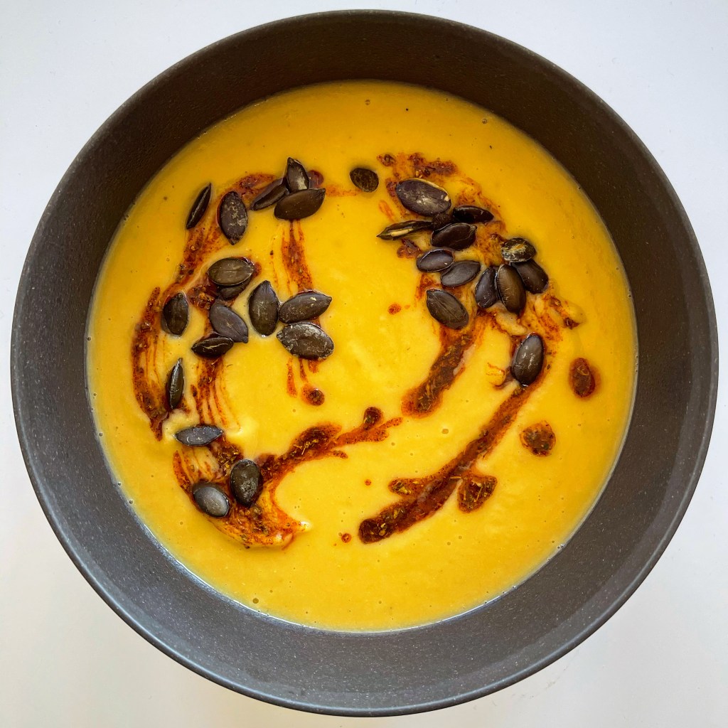 For the topping, combine oil with spices and drizzle on top of soup. Add pumpkin seeds.